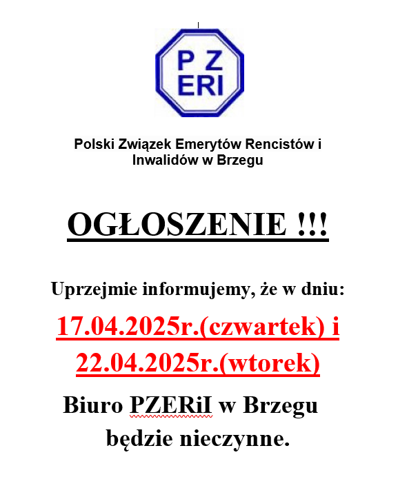 W dniach 17.04.2025r.-czwartek i 22.04.2025r.-wtorek, biuro Związku Emerytów będzie nieczynne