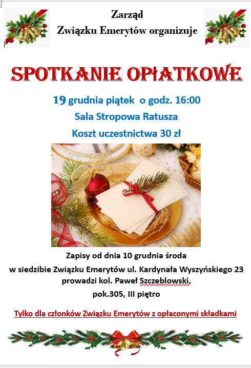 Spotkanie Opłatkowe 19.XII.2025-piątek godz.16:00 Sala Stropowa Ratusza