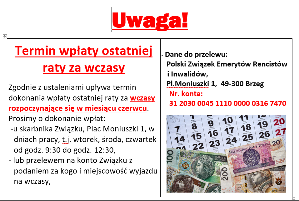 Zgodnie z ustaleniami upływa termin wpłaty ostatniej raty za czerwcowe turnusy wczasowe. Prosimy o dokonanie wpłaty u skarbnika Związku Plac Moniuszki 1 lub przelewem na konto Związku.