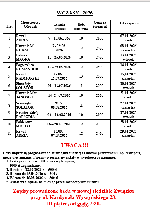 Zapisy na wczasy w 2026 roku – rozpoczęcie 07.01-środa, godz. 7:30, terminy w tabeli