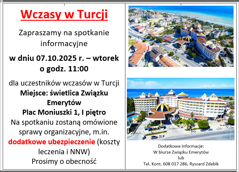 Wczasy w Turcji-zebranie informacyjne-07.10.2025 r,-godz. 11:00, sala konferencyjna Związku Emerytów, Plac Moniuszki 1Autor: pzerii / 2025-09-13